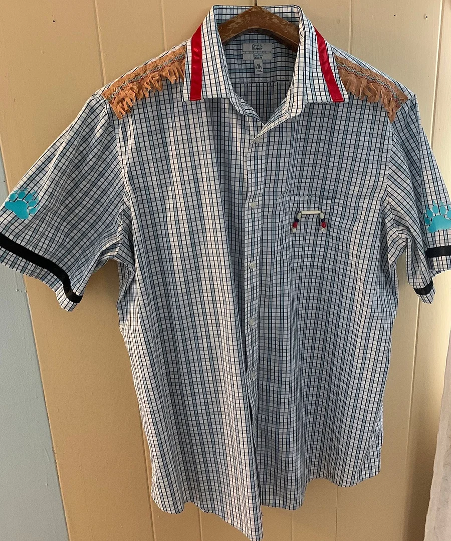 Ribbon Shirt ,Bone Bead, Native Regalia. Short Sleeve, Button Down, Pocket.